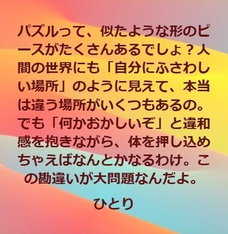 パズルって、似たような形のピースがたくさんあるでしょ?人間の世界にも「自分にふさわしい場所」のように見えて、本当は違う場所がいくつもあるの。···